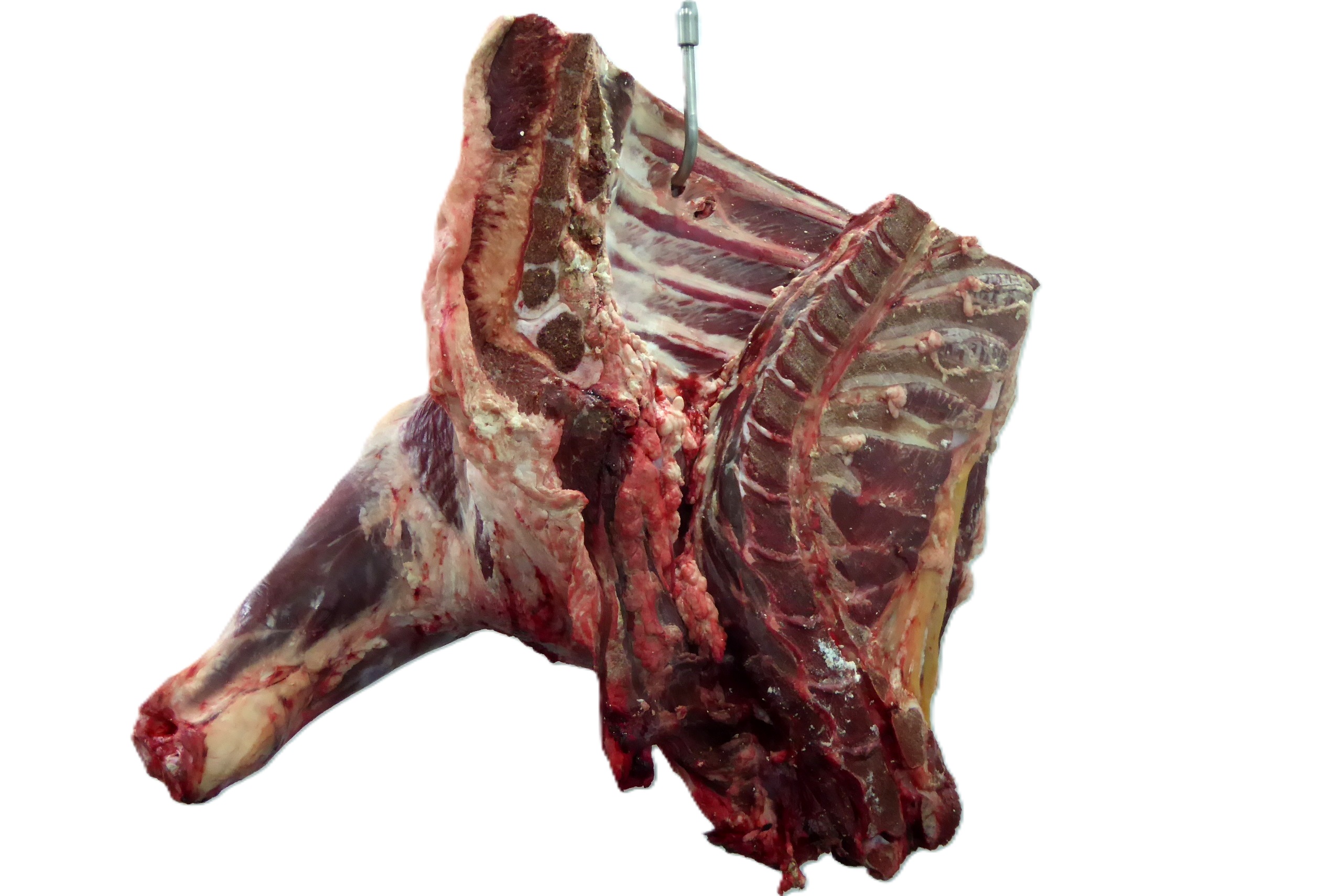 Cuarto delantero de res vacuno es la sección frontal del animal, eviscerada y limpia, que incluye paleta, parte de costillar y cuello, lista para desposte primario y secundario.